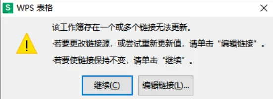 =C3*D:\CXD\[金额.xlsx]Sheet1!$B$1一旦目标文件被移动、重命名或删除,公式就会无法更新,并弹出提示: