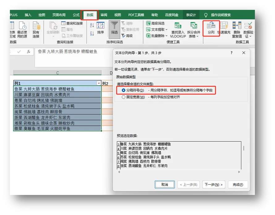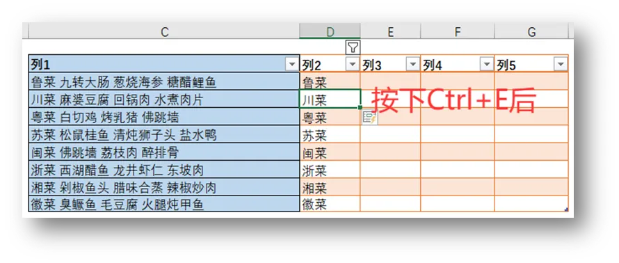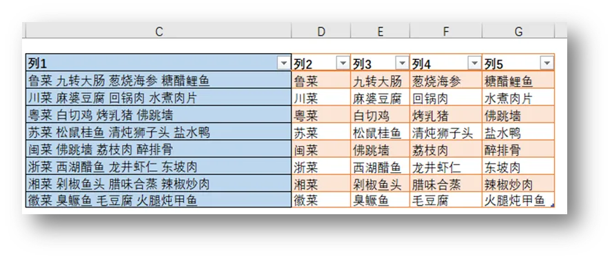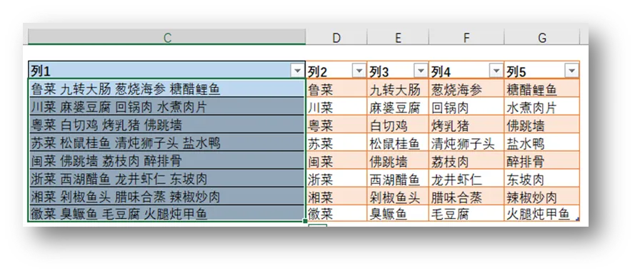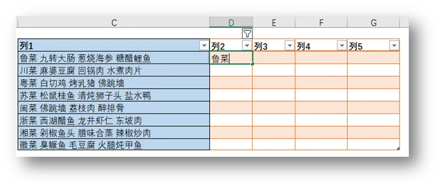 接着几列依次输入“九转大肠”、“葱烧海参”、“糖醋鲤鱼”,重复进行第一列操作,这样就顺利的将列1单元格的内容拆分出来了。