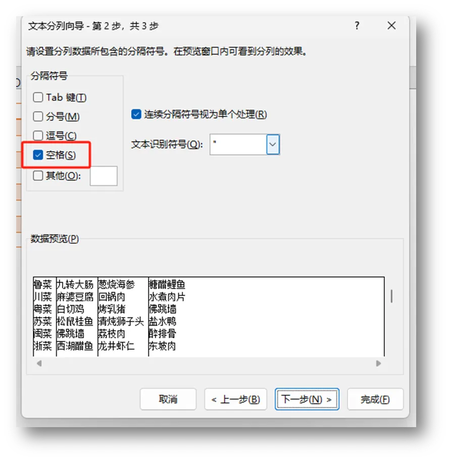 在弹出的对话框中,分割符号选择“空格”,确认数据预览没有问题后,点击“下一步”。