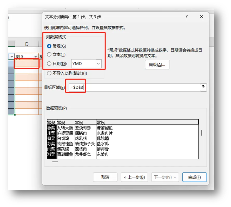 在弹出的对话框中,列数据格式选择“常规”,目标区域选择“=$D$3”。