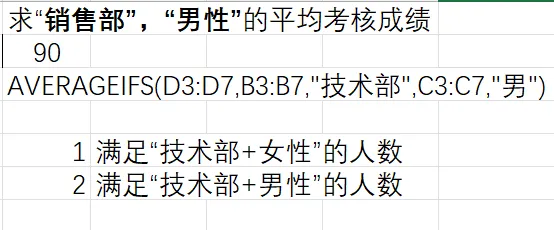 3.=COUNTIFS(B2:B7,"技术部",C2:C7,"女") → 1个