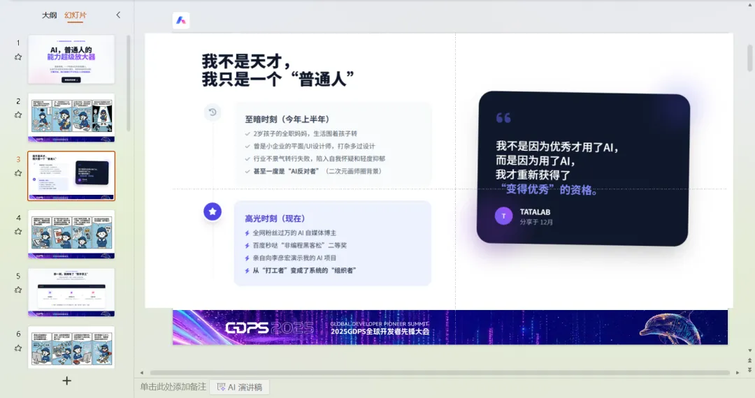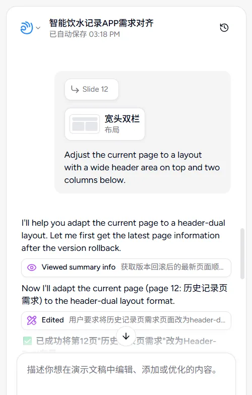 接下来我想分享的是它最让我感觉到"惊喜"的部分。也就是它相较于市面上 PPT 的重点优势:它能够基于我想表达的内容,做出优化我的逻辑,并且给出的 PPT 的排版也非常贴合我的内容与主题