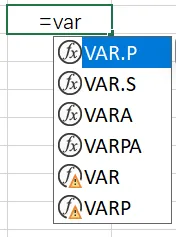 STDEV.P -> VAR.PSTDEV.S -> VAR.SSTDEV -> VARSTDEVP -> VARPSTDEVA -> VARASTDEVPA -> VARPA