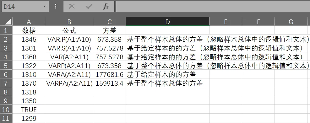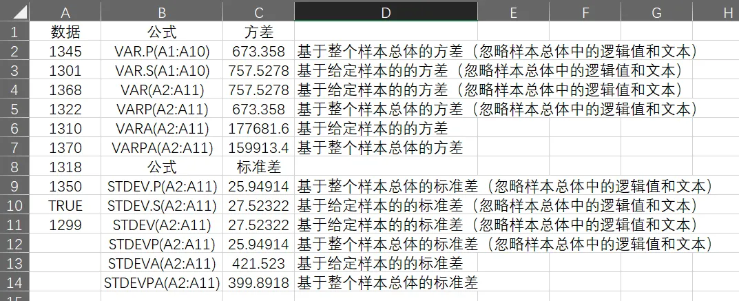 最后介绍VARA函数,VARA函数与VAR.S函数函数区别在于,逻辑值和直代表数字的文本被计算在内。 包含 TRUE 的参数作为 1 来计算;包含文本或 FALSE 的参数作为 0(零)来计算。