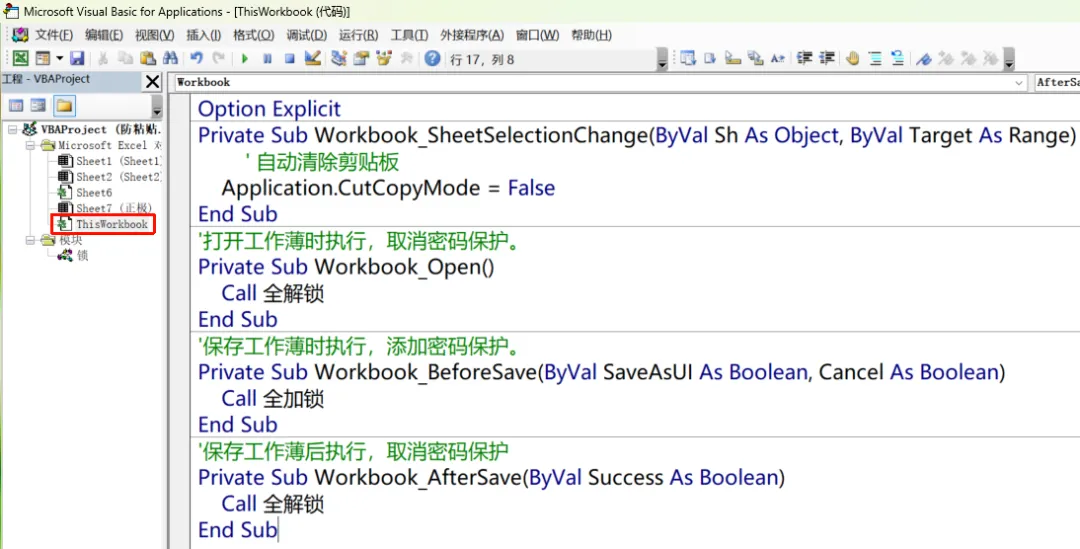 ,如果用户点击上图的"保护工作表"手动设置了密码保护,那么程序运行就会报错,所以呢下面我改了一下程序:Option ExplicitPrivate Sub Workbook_SheetSelectionChange(ByVal Sh As Object, ByVal Target As Range) ' 自动清除剪贴板 Application.CutCopyMode = FalseEnd Sub'打开工作薄时执行,取消密码保护。Private Sub Workbook_Open() Call 全解锁End Sub'保存工作薄时执行,添加密码保护。Private Sub Workbook_BeforeSave(ByVal SaveAsUI As Boolean, Cancel As Boolean) Call 全加锁End Sub'保存工作薄后执行,取消密码保护Private Sub Workbook_AfterSave(ByVal Success As Boolean) Call 全解锁End Sub