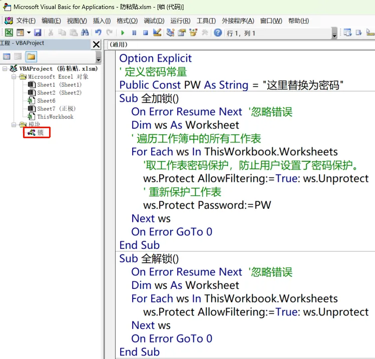 Option Explicit' 定义密码常量Public Const PW As String = "这里替换为密码"Sub 全加锁() On Error Resume Next '忽略错误 Dim ws As Worksheet ' 遍历工作簿中的所有工作表 For Each ws In ThisWorkbook.Worksheets '取工作表密码保护,防止用户设置了密码保护。 ws.Protect AllowFiltering:=True: ws.Unprotect ' 重新保护工作表 ws.Protect Password:=PW Next ws On Error GoTo 0End SubSub 全解锁() On Error Resume Next '忽略错误 Dim ws As Worksheet For Each ws In ThisWorkbook.Worksheets ws.Protect AllowFiltering:=True: ws.Unprotect Next ws On Error GoTo 0End Sub