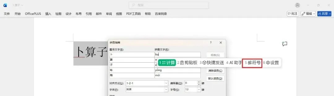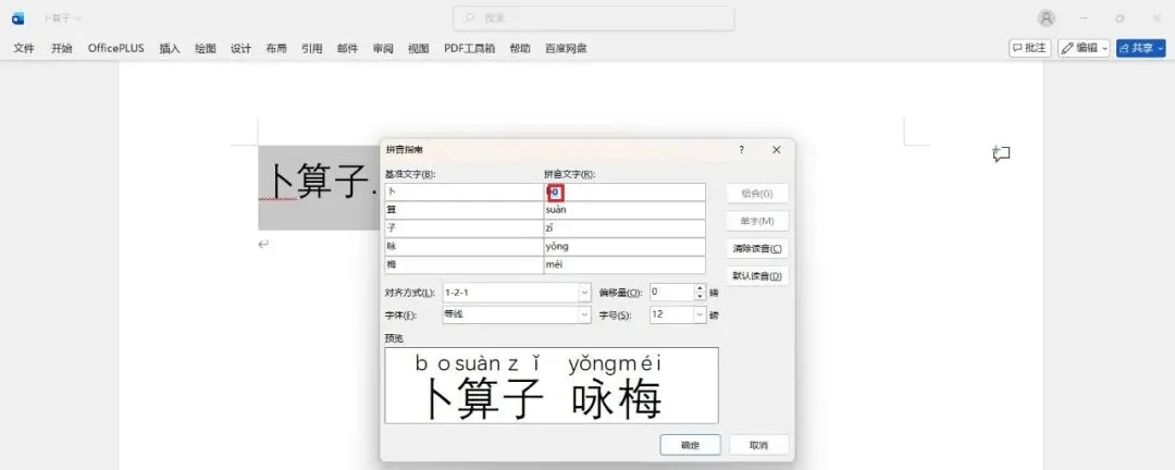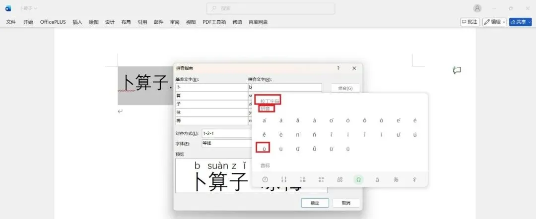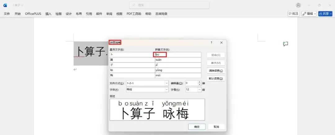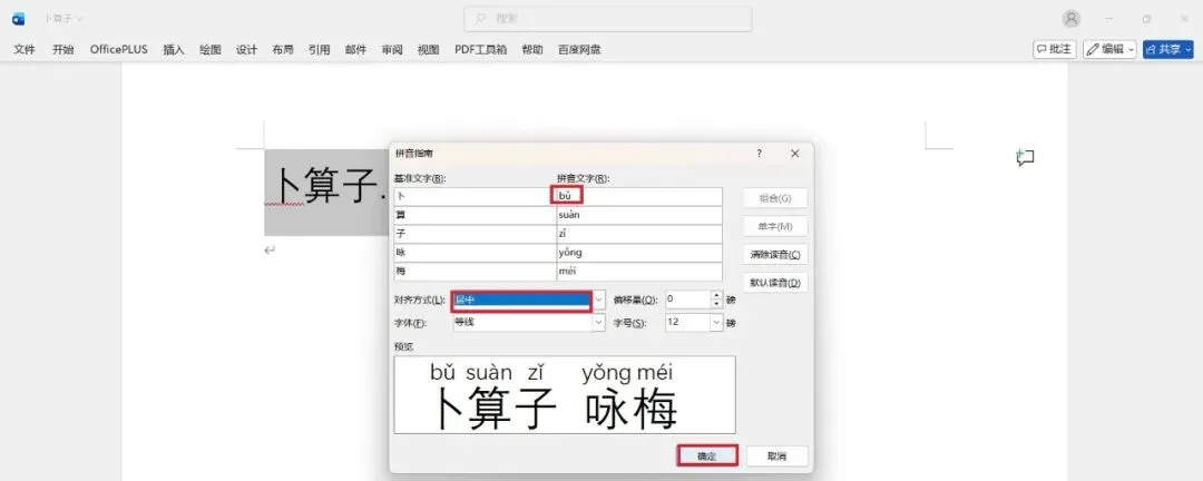 3、鼠标左键单击“拼音指南”,弹出“拼音指南”对话框,核对拼音字体、字号、对齐方式,发现“卜”拼音不正确。 如:图3。