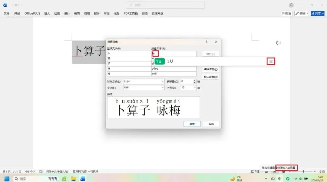 10、小结:如何在Word文档中给文字添加拼音或修改拼音及音调?打开Word文档,选中需要添加拼音的文字“卜算子.咏梅”。选择“开始”,“拼音指南”。鼠标左键单击“拼音指南”,弹出“拼音指南”对话框,核对拼音字体、字号、对齐方式,发现“卜”拼音不正确。按住鼠标左键滑动,选中“o”;然后,按Delete键删除。在微信输入法中文输入法状态下,输入“u”,弹出插入文本框,将鼠标光标右移到文本框右端红色方框处,光标变成手型后,单击鼠标左键,弹出“选项菜单”,单击选择“5符号”,弹出插入选项,滑动左侧滑块,找到“拉丁字母,拼音,u”的三声音调,单击插入。设置对齐方式为居中,然后,单击“确定”。