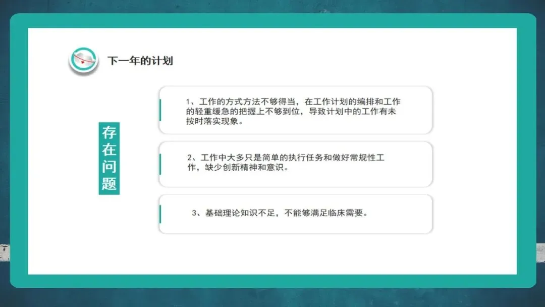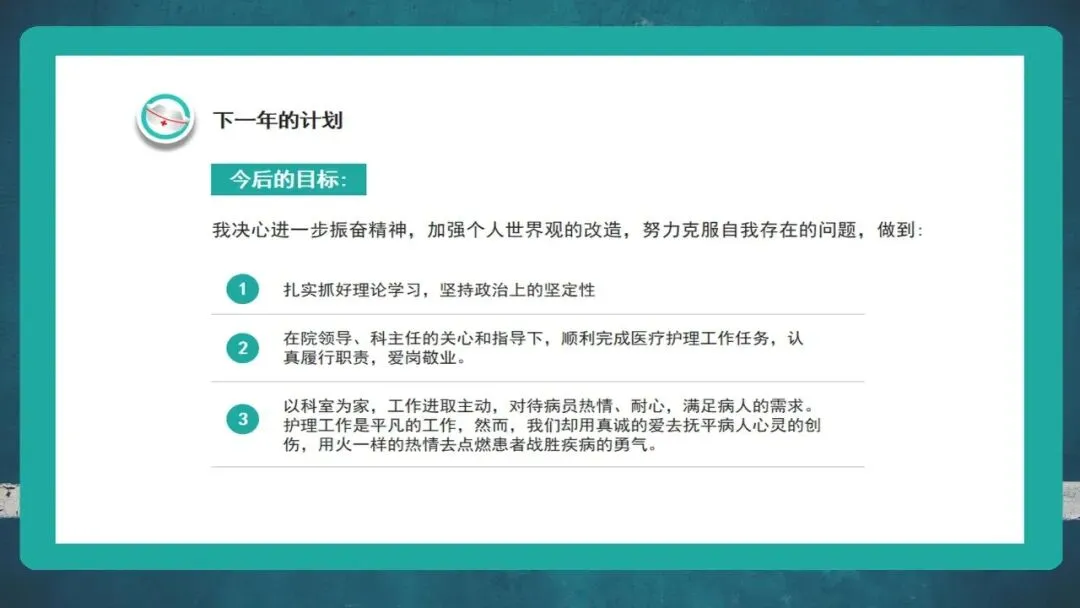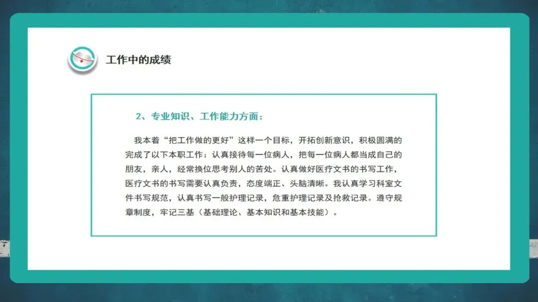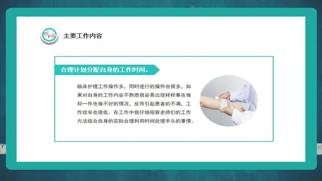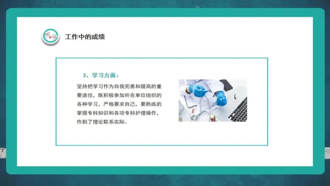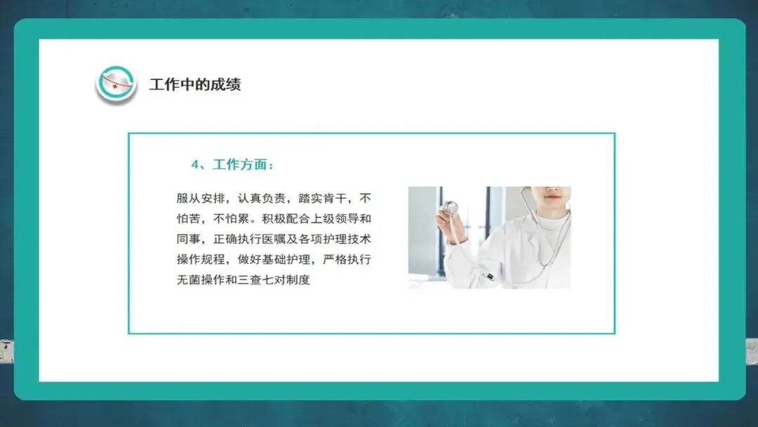 过去一年,我专注于提升护理操作的专业性与安全性,从输液、吸氧到急救操作,不断规范流程、防范风险。还记得第一次参与抢救时的紧张无措,但在老师的带教和应急预案的学习中,我逐渐学会了沉着应对。同时,我也积极参与科室管理工作,承担护理查房、医疗器具管理等任务,这些经历让我真正成长为科室的“主人翁”。