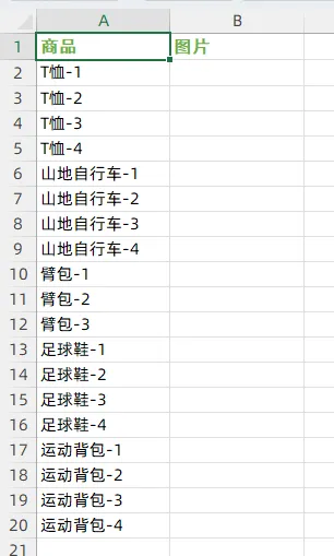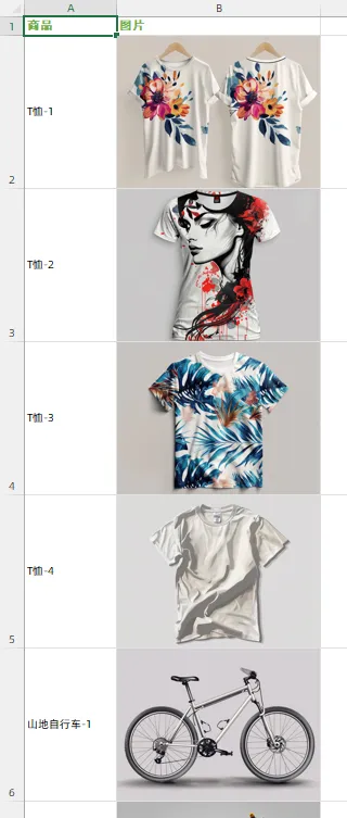 完成导入后的图片效果,导入的图片会根据A列的商品名称对应显示在B列单元格中。