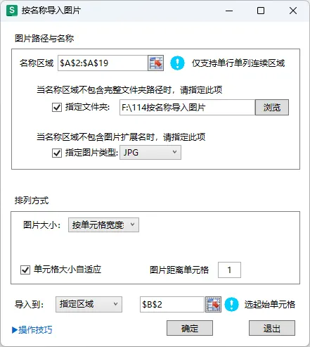 选择图片大小,按单元格宽度,导出到指定区域,选择存放图片起始单元格,单击确定。