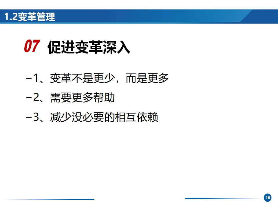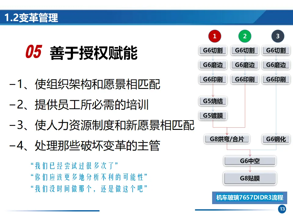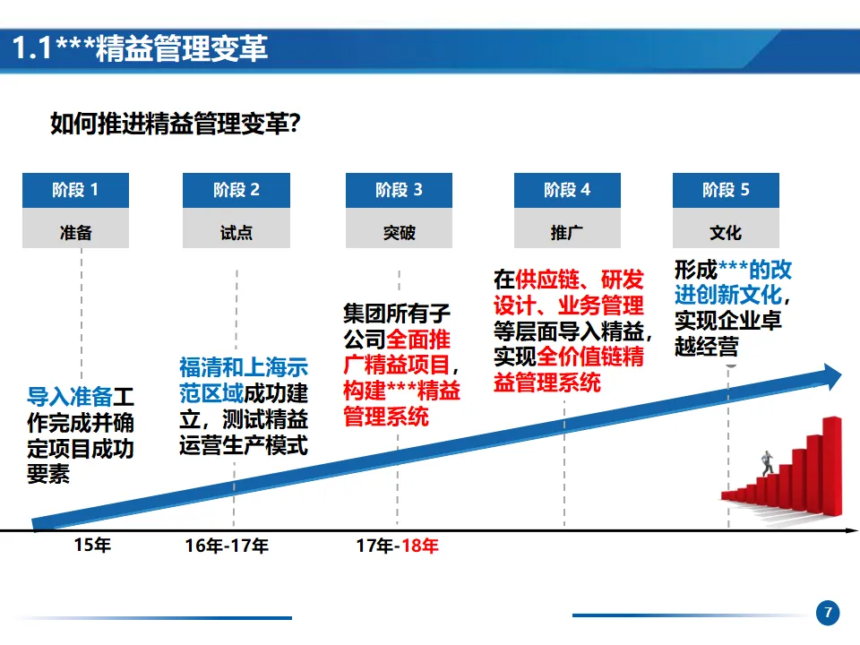 。随着初期成果显现,组织信心增强,此时应加大投入,扩大变革范围。从1条示范线扩展到3条,从生产部门扩展到质量、物流、研发部门。变革初期可能只需要5-10名骨干,深入阶段需要50-100名内部改善专员。
