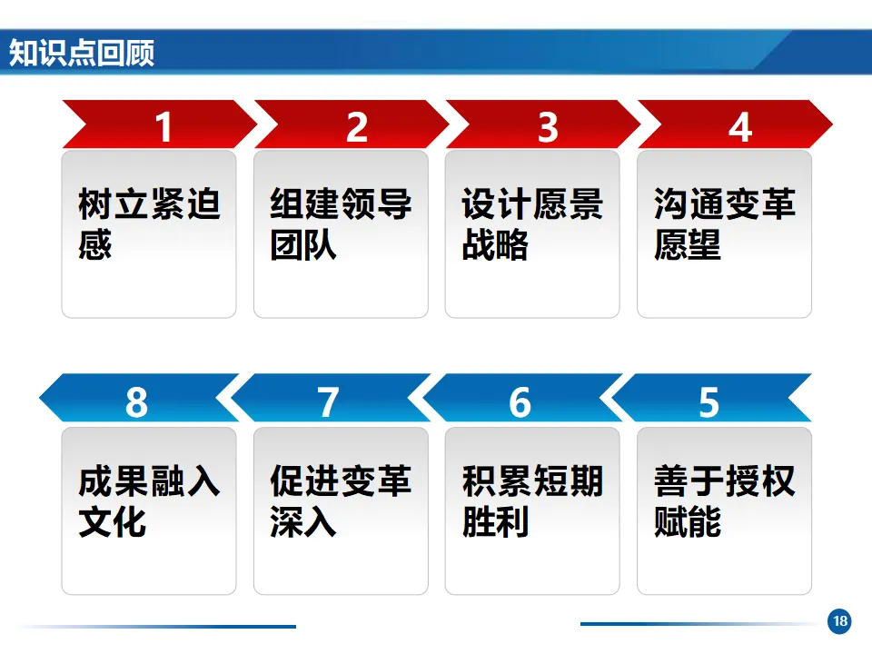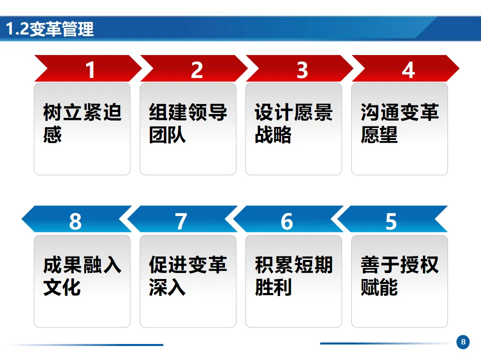 变革管理八个步骤环环相扣:树立紧迫感→组建领导团队→设计愿景战略→沟通变革愿望→善于授权赋能→积累短期胜利→促进变革深入→成果融入文化。