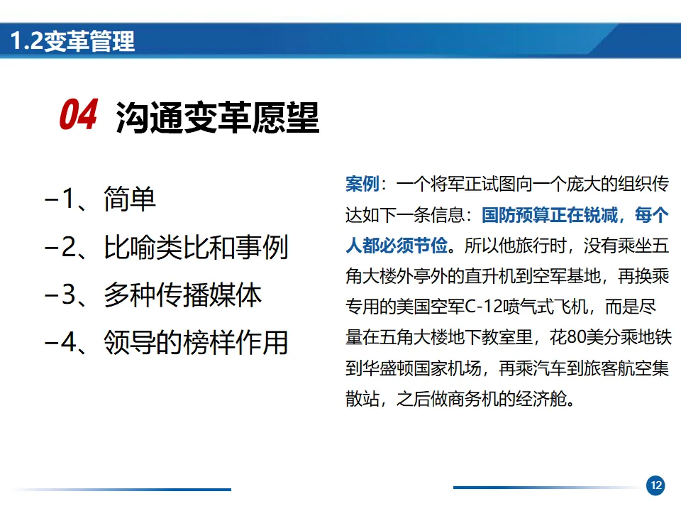 。抽象理念需要用具体案例来解释。前述案例中,将军为了传达国防预算削减必须节俭的信息,放弃专用飞机和直升机,改乘地铁和经济舱。这个具体行为比任何口号都更有说服力。在企业中,管理者可以通过亲身参与改善活动、带头执行新标准来强化沟通效果。