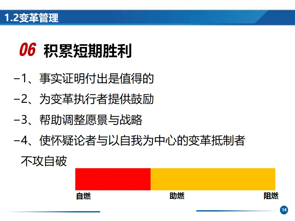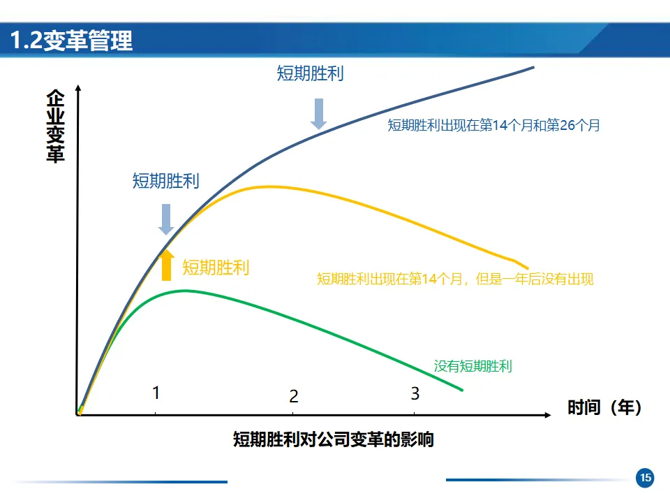 长期变革需要短期胜利来支撑。如果变革持续很长时间看不到成果,人们会失去信心和耐心。短期胜利是变革的"燃料",能够持续激励组织前行。