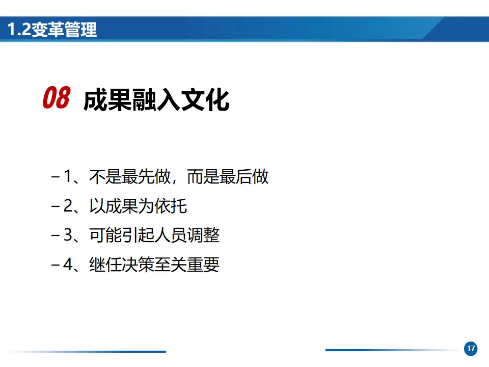 变革的最终目标是让新思维、新行为成为组织文化的一部分,而不是依赖外部推动。文化的改变是缓慢的,通常需要3-5年时间。