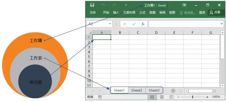 工作簿、工作表和单元格是 Excel 操作中最常见的三大对象。工作簿是 Excel 中用来存储并处理数据的文件;工作表是显示在工作簿窗口中的表格,是 Excel 存储和处理数据最重要的部分;单元格则是将整个工作表划分成每一个小方格,是 Excel 中构成工作表最基础的组成元素,是存储数据的最小单位。简单地说,工作簿是由单张或多张工作表组成的;而工作表则是由一个个单元格组成的,如下图所示。