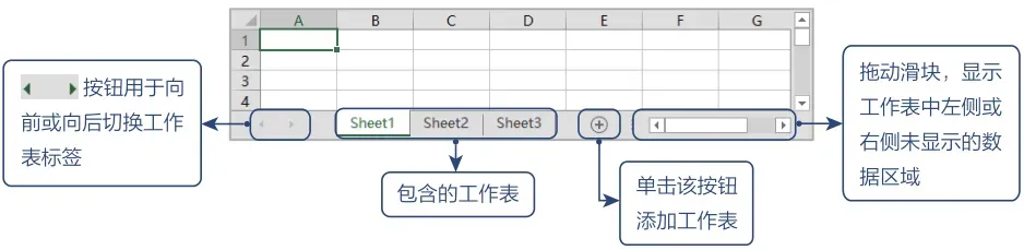 每一个工作簿中包含了一张或多张工作表,它们以工作表标签的形式显示在工作簿编辑区底部。下图所示为工作表标签。在 Excel 中,每个工作表的名称都是唯一的,默认的是以“Sheet1”进行命名。为了方便识别工作表中的内容,可以为工作表重新命名。