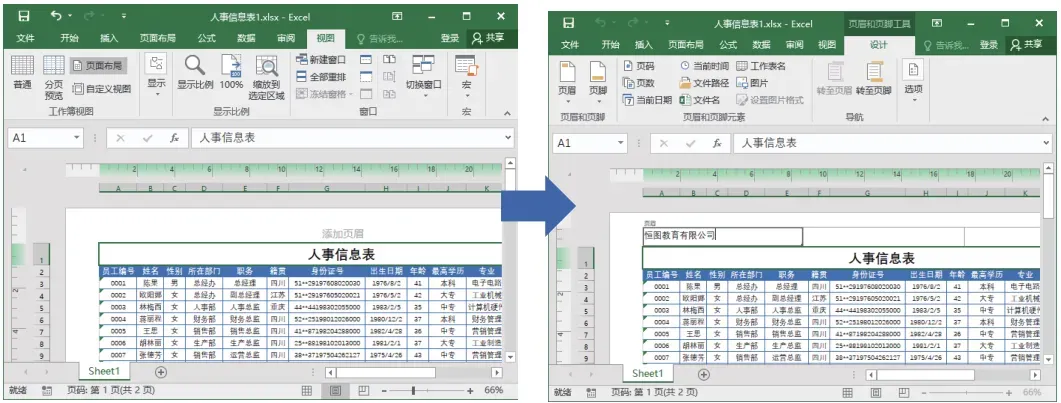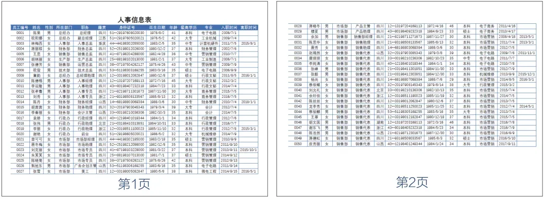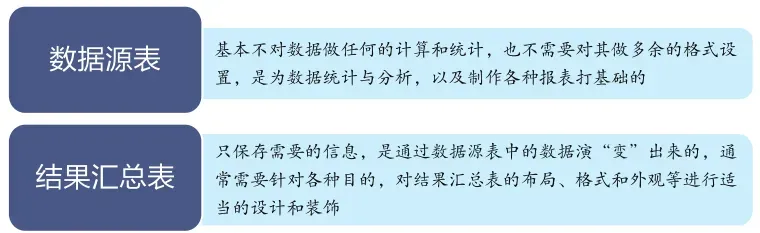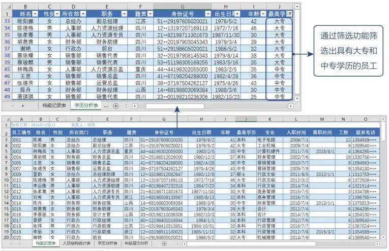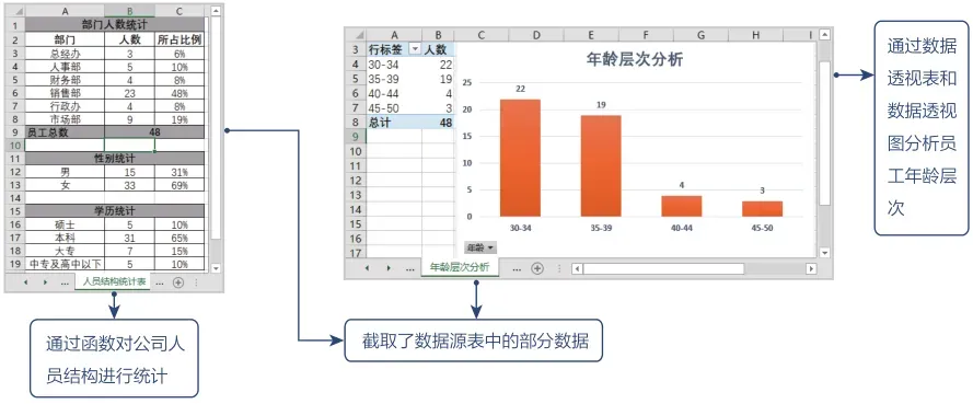数据源表主要是用于记录和存储各种基础的数据,便于结果汇总表引用数据;而结果汇总表是利用 Excel 的功能或工具对数据进行汇总、分析,从而得到所需要的结果。下图所示为两张表的区别。例如,下图所示为通过“员工记录表”数据源表得出的学历分析表、人员结构统计表、年龄层次分析表等多张结果汇总表。