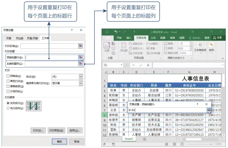 在【页面布局】选项卡下的【页面设置】组中单击【打印标题】按钮,打开【页面设置】对话框,单击【顶端标题行】文本框后的 按钮,如左下图所示。