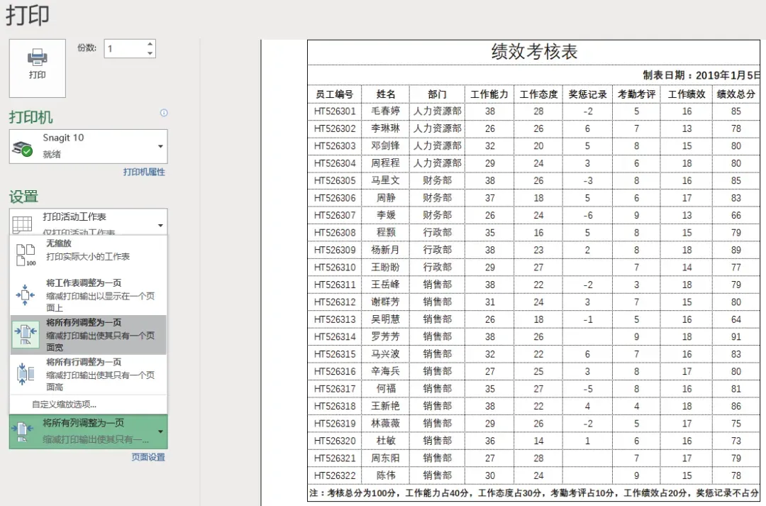 当一页打印不完,两页打印第2 页内容又较少时,可以在【打印】页面中的【无缩放】下拉列表中选择相应的缩放选项,根据实际情况调整缩放比例,将所有打印内容放在同一页中进行打印。