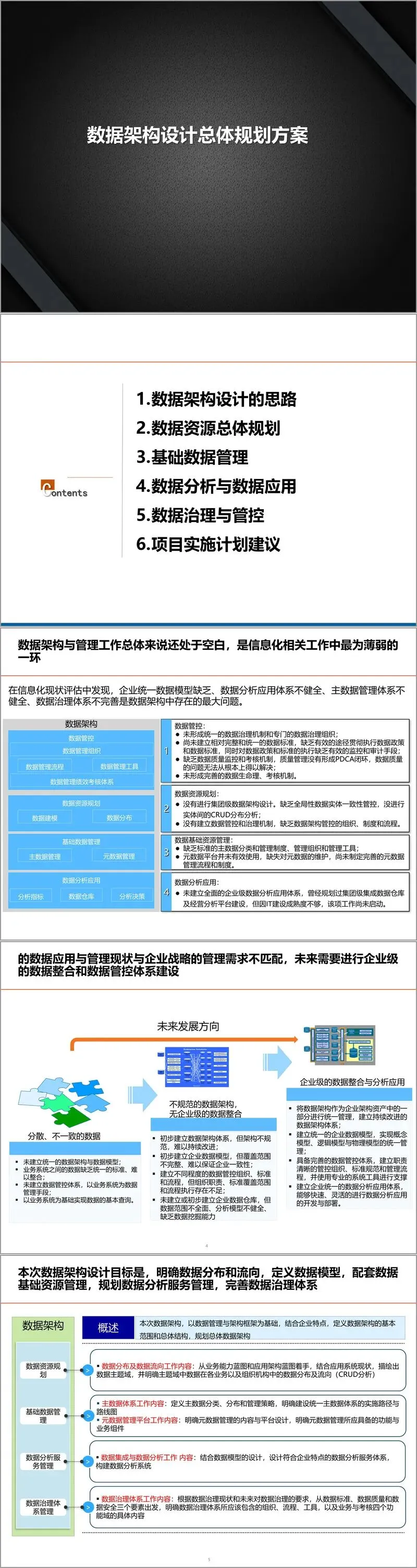 为此,本次规划明确提出以“企业级数据整合与管控”为核心目标,通过明确数据分布与流向、定义统一数据模型、配套基础数据管理、规划数据分析服务、完善数据治理体系五大举措,构建未来数据架构的总体框架。该框架将紧密围绕业务蓝图、应用蓝图与技术蓝图,确保数据架构与业务战略、技术路线协同一致。