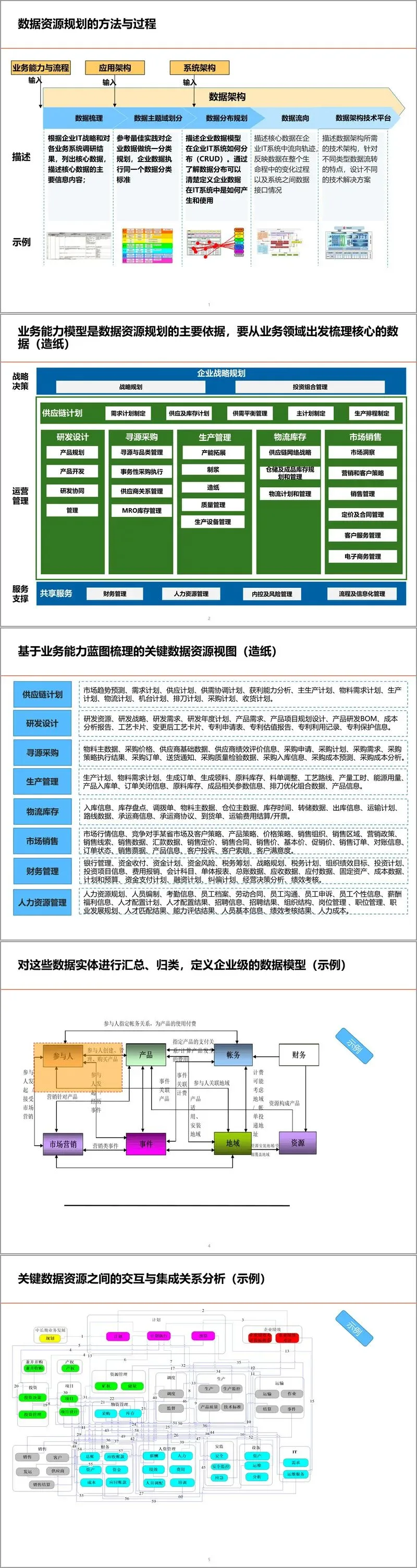数据资源规划是数据架构的基础。方案提出以业务能力模型为核心依据,系统梳理企业核心数据资源。以造纸行业为例,从供应链计划、研发设计、寻源采购、生产管理、物流库存、市场销售、财务管理到人力资源,逐一识别关键数据实体,并对其进行归类与整合,形成企业级的概念与逻辑数据模型。