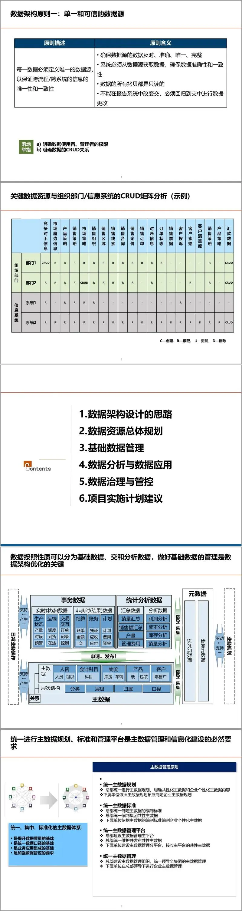 基础数据是数据架构的“骨架”,其中主数据与元数据的管理尤为关键。方案指出,必须建立“统一规划、统一标准、统一平台、统一管理”的主数据体系,涵盖客户、产品、物料、供应商等核心主题域。