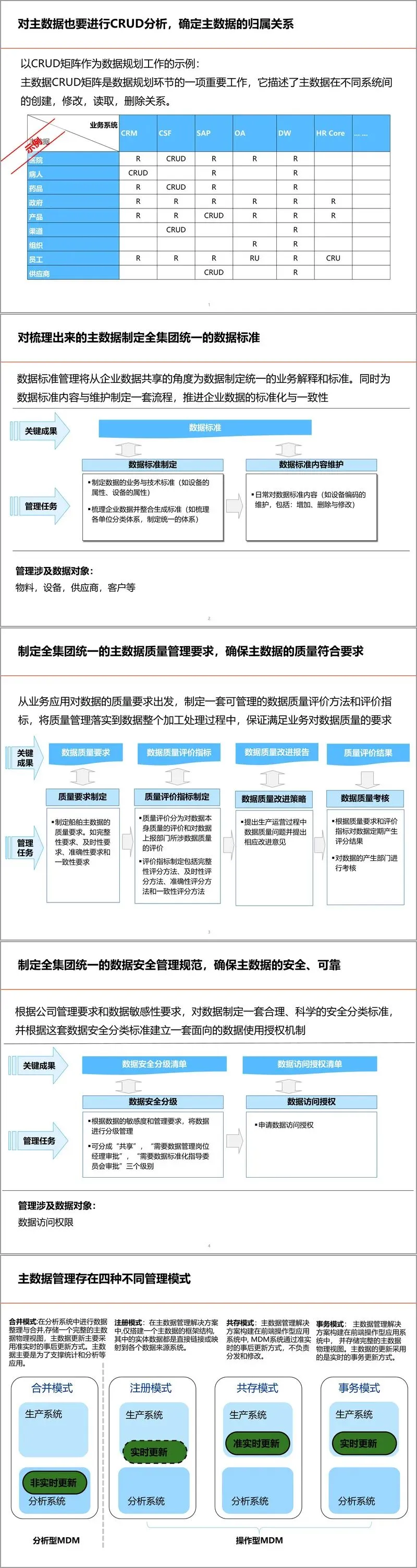 主数据管理需分阶段推进:从规划与组织建设起步,逐步推进管理平台搭建、系统改造与治理体系完善。在管理模式上,可根据数据特点选择注册型、共存型、事务型或合并型等不同实施模式。同时,配套制定全集团统一的数据标准、质量要求与安全规范,确保主数据在全生命周期内的准确性、一致性与安全性。