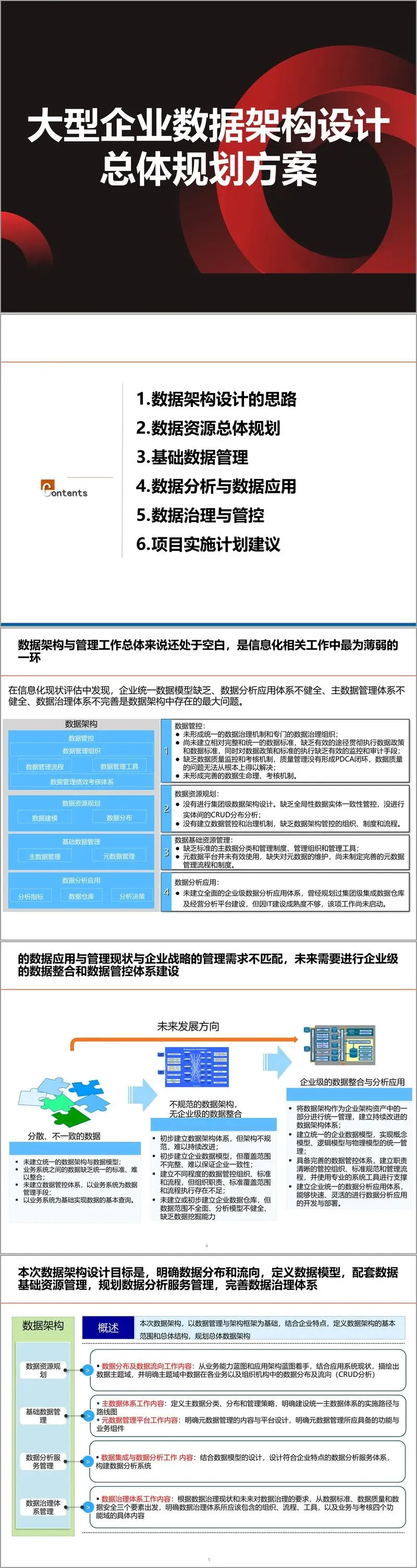 该方案首先指出,企业在数据架构方面整体处于空白状态,存在统一数据模型缺失、主数据管理体系不健全、数据分析应用体系不完善、数据治理机制欠缺等关键问题。数据分散、标准不一、缺乏整合,严重制约了企业从数据中获取价值的能力。为此,方案提出以“企业级数据整合与管控”为核心目标,构建涵盖数据资源、数据建模、数据分布、数据治理、数据分析与应用在内的完整架构体系。