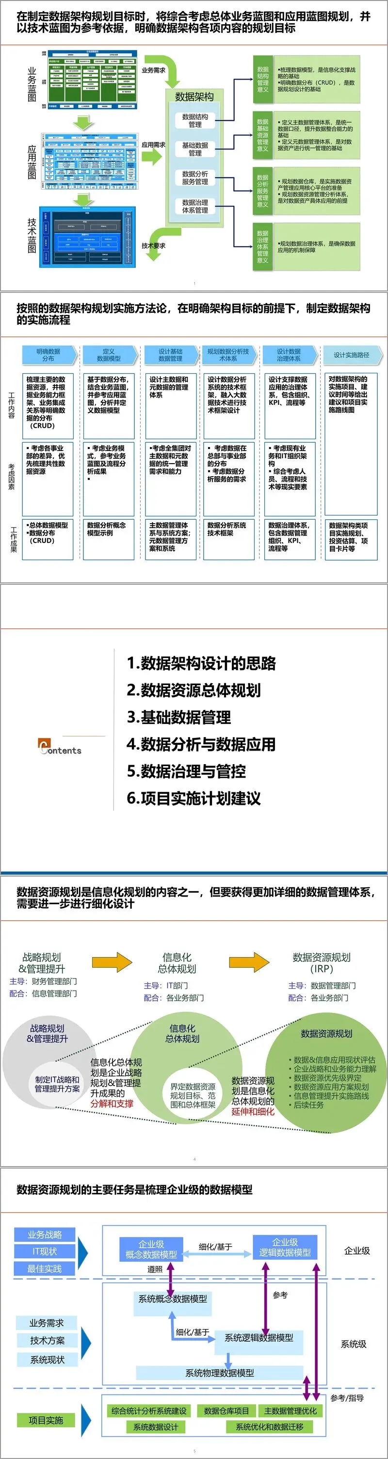 在数据架构设计思路上,方案强调以业务蓝图、应用蓝图和技术蓝图为依据,明确数据分布与流向,定义企业级数据模型,并配套基础数据资源管理和数据分析服务体系。通过业务能力框架和流程分析,梳理核心数据资源,形成统一的数据主题域划分,并基于CRUD矩阵明确数据的创建、读取、更新、删除关系,确保数据在系统间的流转清晰可控。