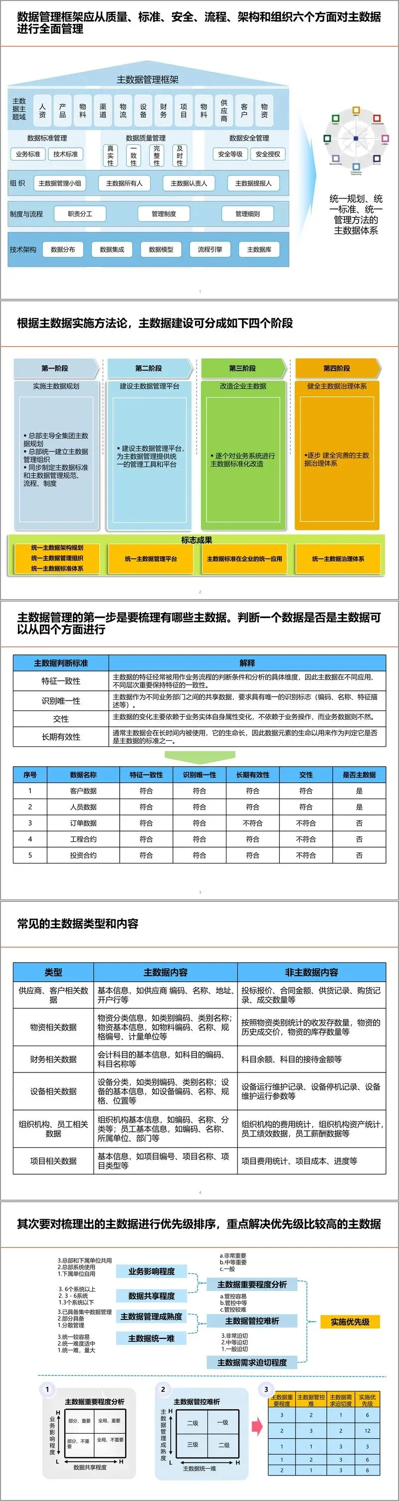 在基础数据管理方面,方案重点聚焦主数据与元数据管理。主数据作为企业核心业务实体,其统一规划、标准制定、平台建设与管理组织是提升数据质量、统一数据口径、支撑业务集成的关键。方案提出分四个阶段推进主数据体系建设:规划先行、平台建设、数据改造、治理完善,并通过对主数据的重要性、共享度、成熟度、迫切性等维度进行优先级评估,有序推进实施。