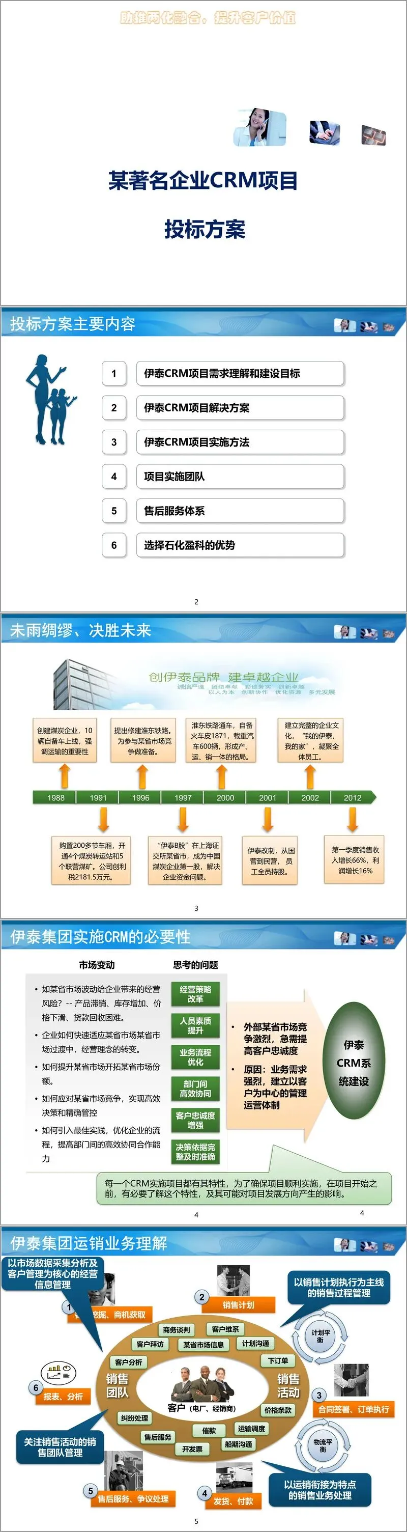 综上所述,这份投标方案结构严谨、内容详实,不仅提出了具体的技术解决方案,更从业务变革、项目管理、风险控制、长期运维等多维度进行了全面规划,展现了石化盈科帮助伊泰集团通过CRM系统建设提升核心竞争力、实现数字化转型的实力与诚意。