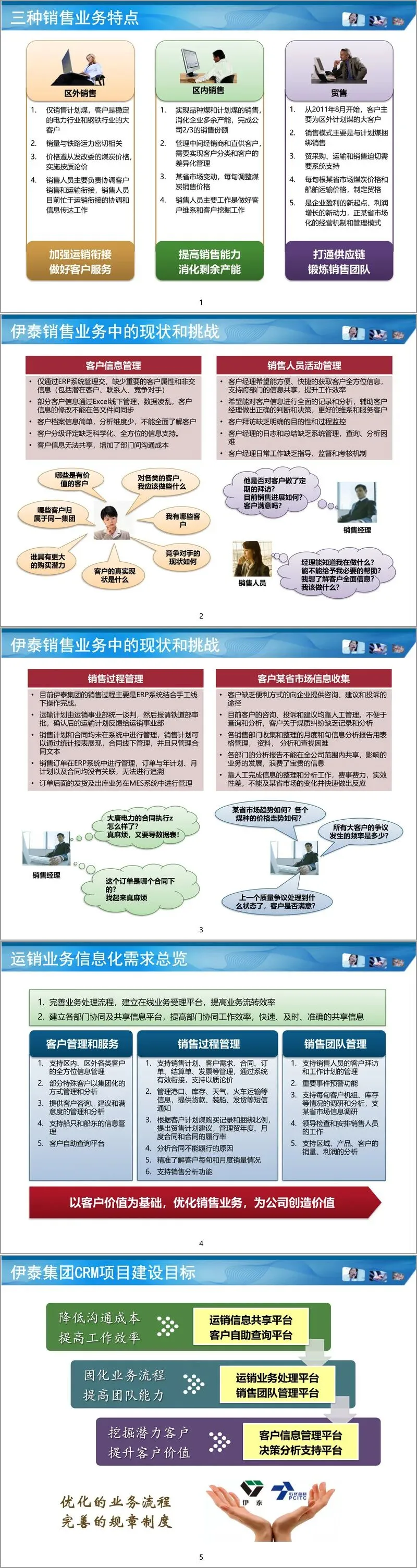 伊泰集团作为一家从国营改制为民营、并实现全员持股的煤炭企业,历经多年发展,形成了产、运、销一体的业务格局。然而,面对激烈的外部市场竞争,集团在客户管理、销售过程、部门协同以及决策支持等方面面临诸多挑战。方案深入分析了伊泰的业务现状,指出其存在客户信息分散、销售过程不透明、市场响应速度慢、部门间信息壁垒等问题,导致客户忠诚度不高、经营风险加剧。