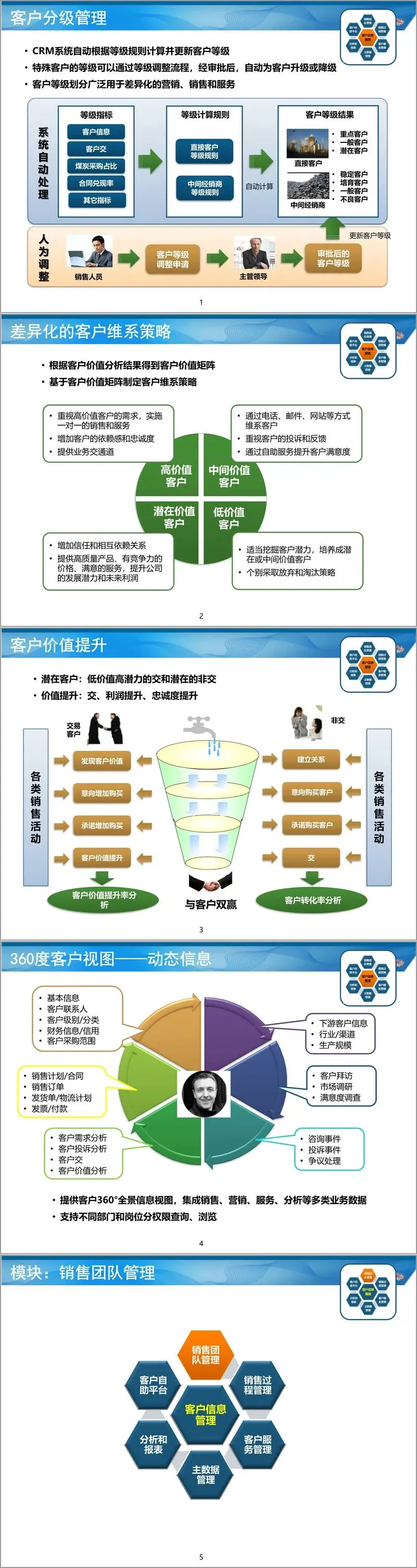 - 客户信息管理:建立统一的客户信息模型,实现客户准入、信息维护、退出等流程的规范化。实施客户分级管理,根据价值矩阵制定差异化营销策略,并提供360度客户全景视图,全面掌握客户动态。