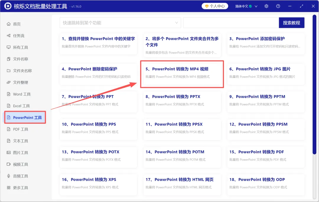 1、打开【核烁文档批量处理工具】,选择【PowerPoint工具】-【PowerPoint转换为MP4视频】。