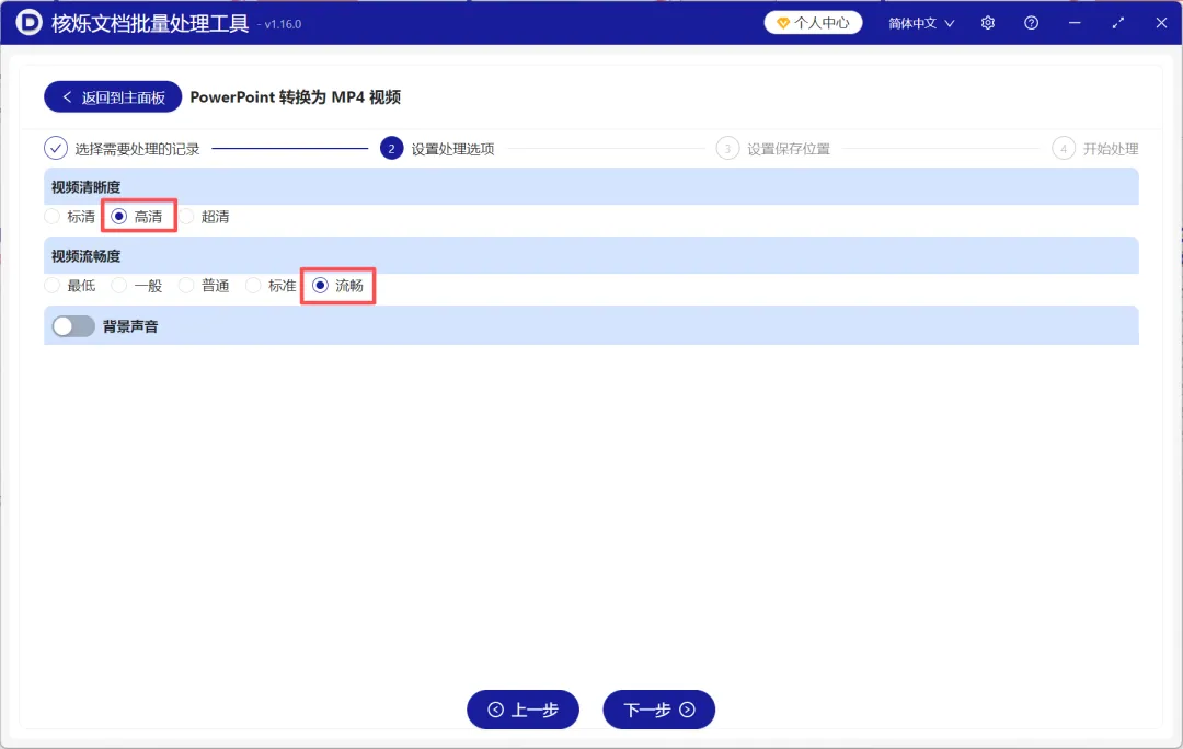 3、根据自己的需求,设置视频的清晰度和流畅度。要添加背景声音的话,点击【选择文件】,将音频文件加到这里。如果不需要添加背景声音,则不打开这个选项。