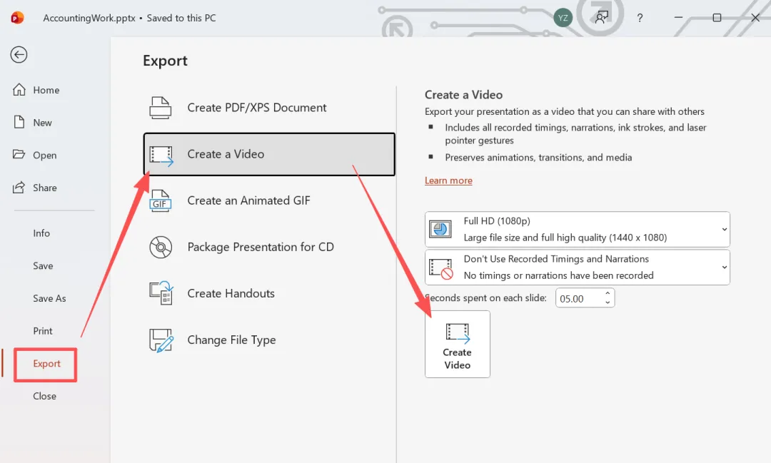 打开需要转换的PPT幻灯片,点击【文件】-【导出】-【创建视频】,选择视频质量,设置好每张幻灯片播放的秒数,最后点击【创建视频】就可以了。