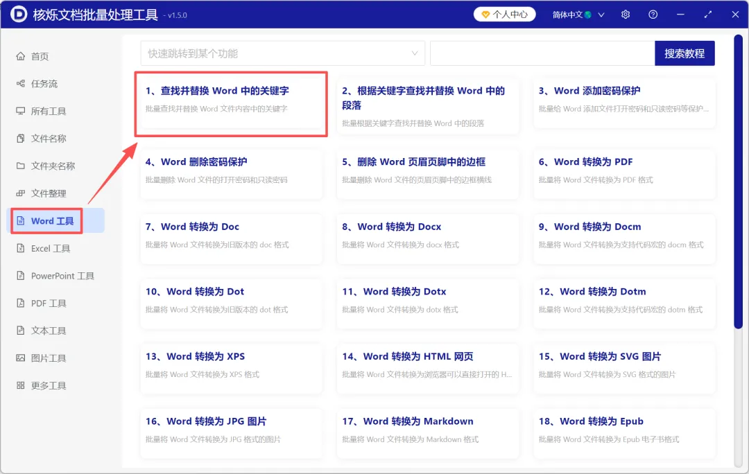 1、打开核烁文档批量处理工具,选择Word工具→查找并替换Word中的关键字。