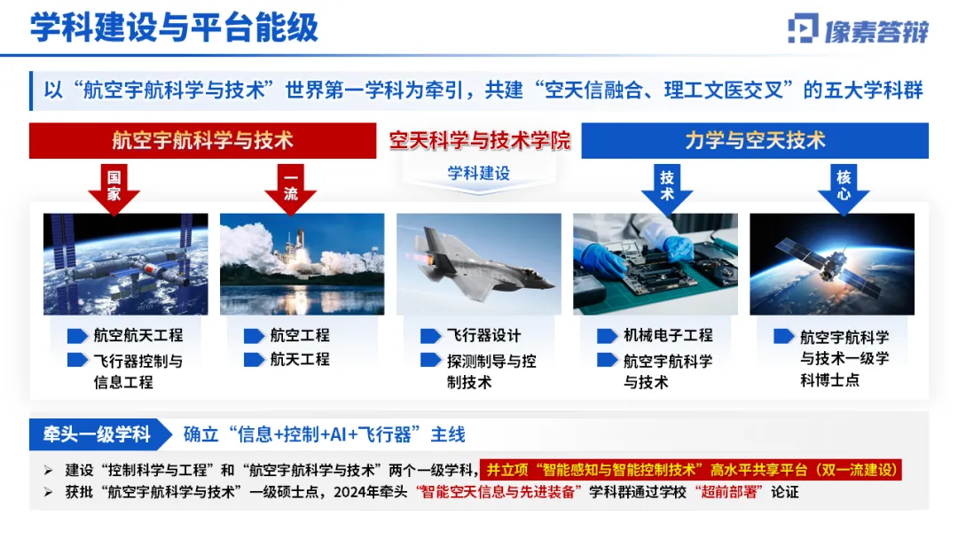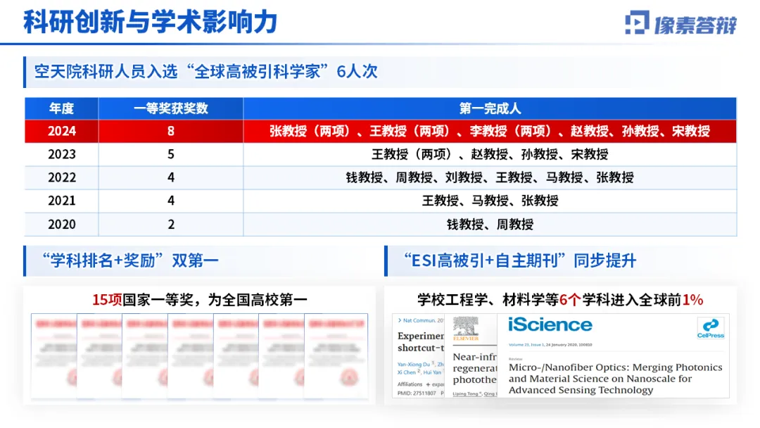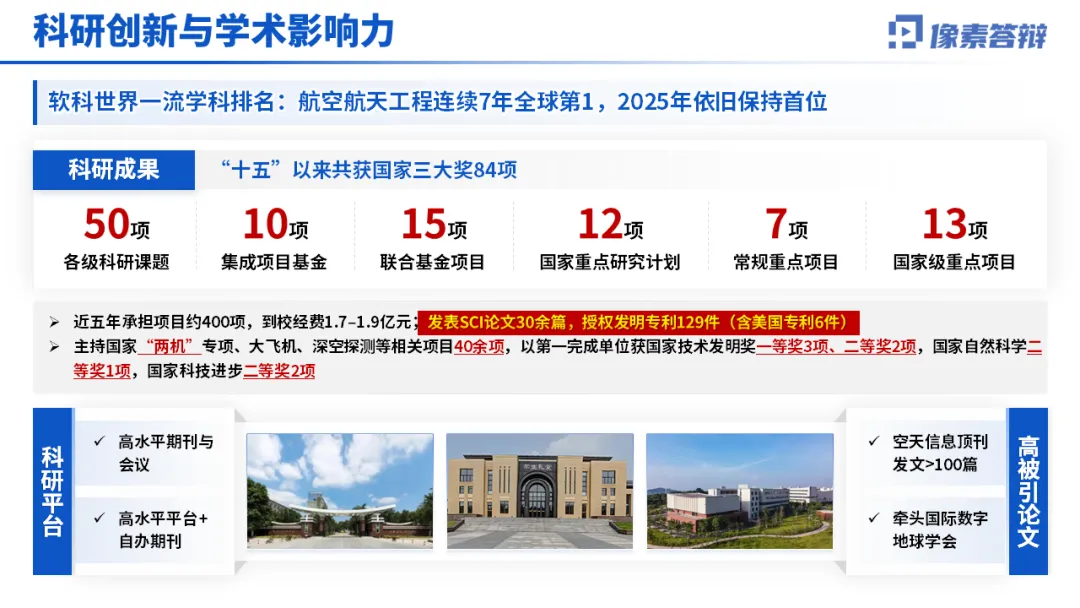 1.科研创新打头阵 先亮硬核成果,比如学科排名、国家奖项、论文专利等,用数据和荣誉抓住眼球。像这份 PPT 就直接突出 “航空航天工程连续 7 年全球第 1”“国家三大奖 84 项”,气场直接拉满。