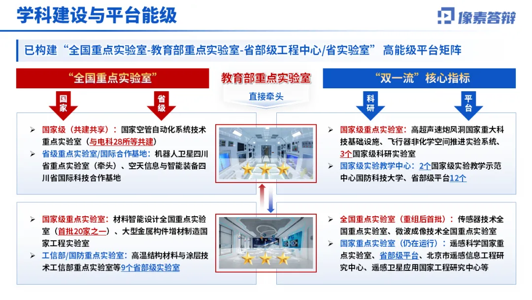 2.学科平台做支撑 接着讲学科建设和平台矩阵,体现学院的硬实力。比如列出全国重点实验室、省部级平台等,用 “平台 — 学会 — 期刊” 的体系,展现学科的完整性。