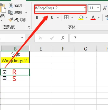 同样的方法,输入 R,显示带方框的√;输入 S,显示带方框的×。(WPS 同理~)