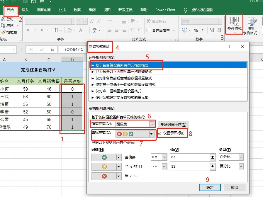 选中需要设置的区域,点击【开始】——【条件格式】——【新建格式规则】——【基于各自值设置所有单元格的格式】,【格式样式】选择【图标集】,【图标样式】选择圆圈的√和×,勾选【仅显示图标】,最后选择【确定】。