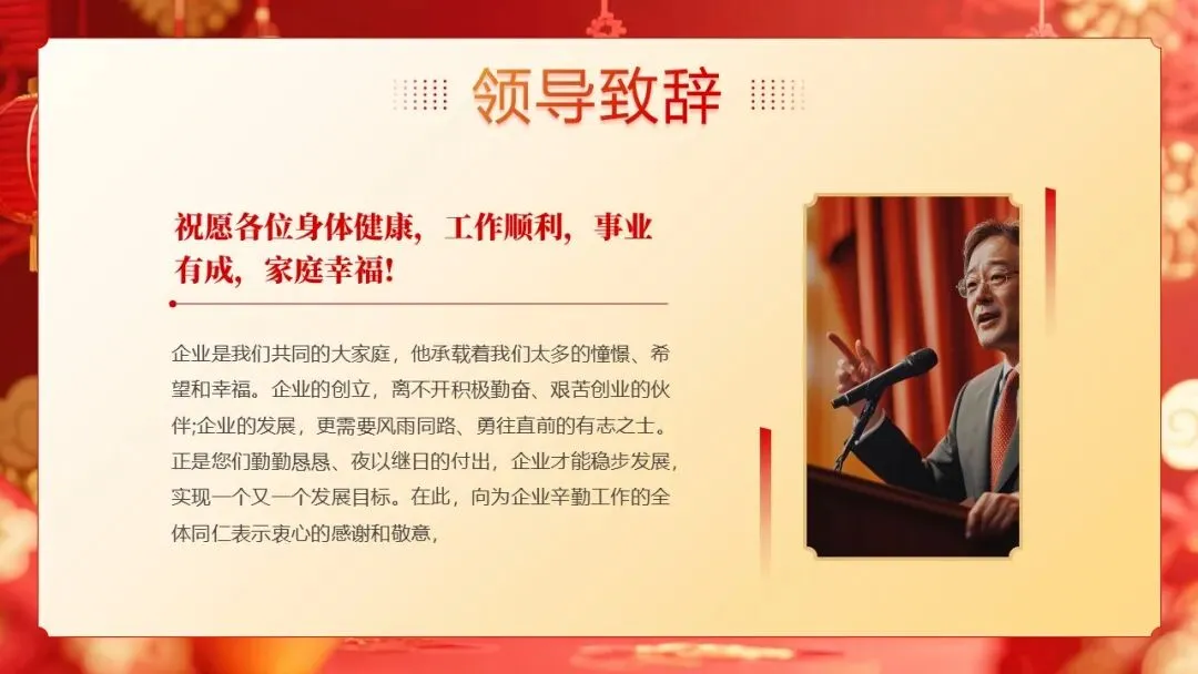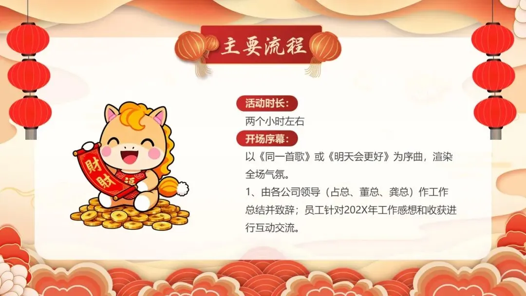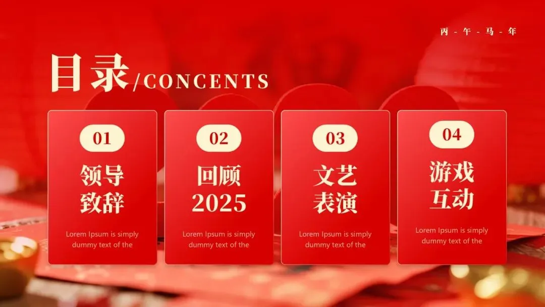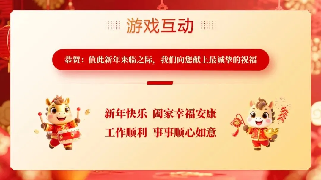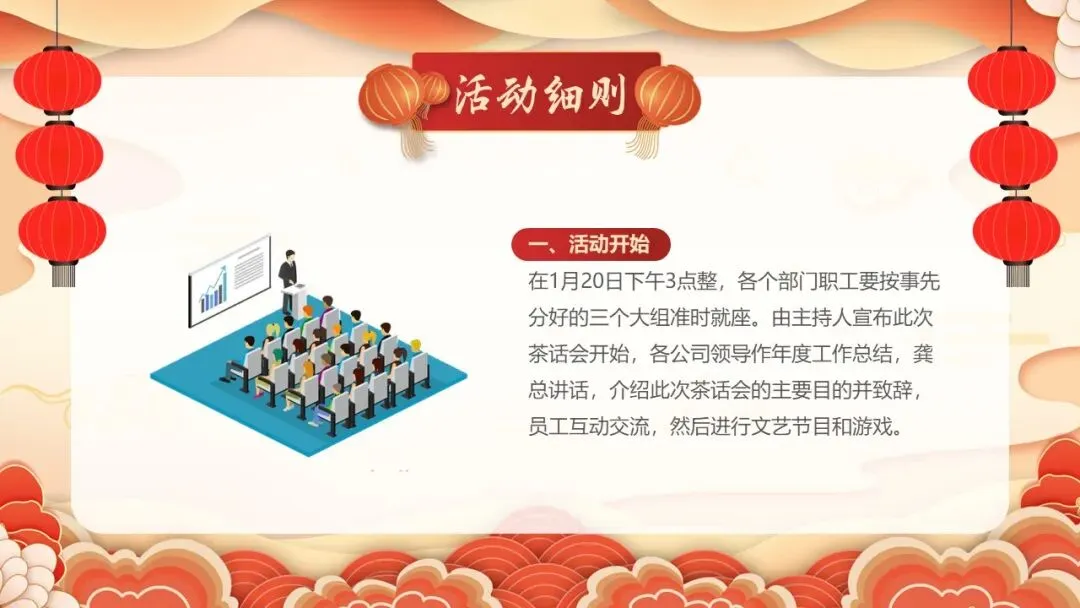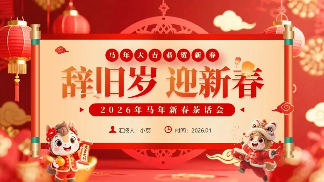 还有十多天就要迎来2026年新春佳节了,现在很多公司都在举办和组织团建、茶话会等相关活动,这次就应大家的反馈需求,给大家带来四款关于2026年马年新春茶话会的PPT模版,全部都是带有现成示例内容和完整框架结构的,有需要举办茶话会等新年公司团建活动柜的老师和同学,都可以拿来参考借鉴一下,希望上面的思路能够帮助到大家,谢谢大家的支持!以下是2026年马年新春茶话会PPT模版的视频展示:下面是部分2026年马年新春茶话会PPT模版示例内容:2026年马年新春茶话会PPT模版获取方式如下: