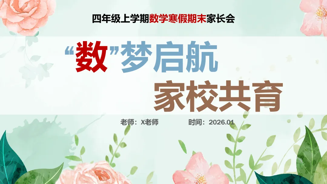 很高兴在这与您相遇,如果您是一位班主任老师,每天除了应对繁重的教学工作,还要加班整理班级、教务、教研、课件PPT资料,请关注下方的“小雨教务资料”,让我们风雨同路、一起成长~今天分享的是四年级数学秋季上期末家长会的ppt课件和配套的发言稿,主题是《“数”梦启航,家校共育》。【四上】【数学】【“数”梦启航,家校共育】期末家长会发言稿