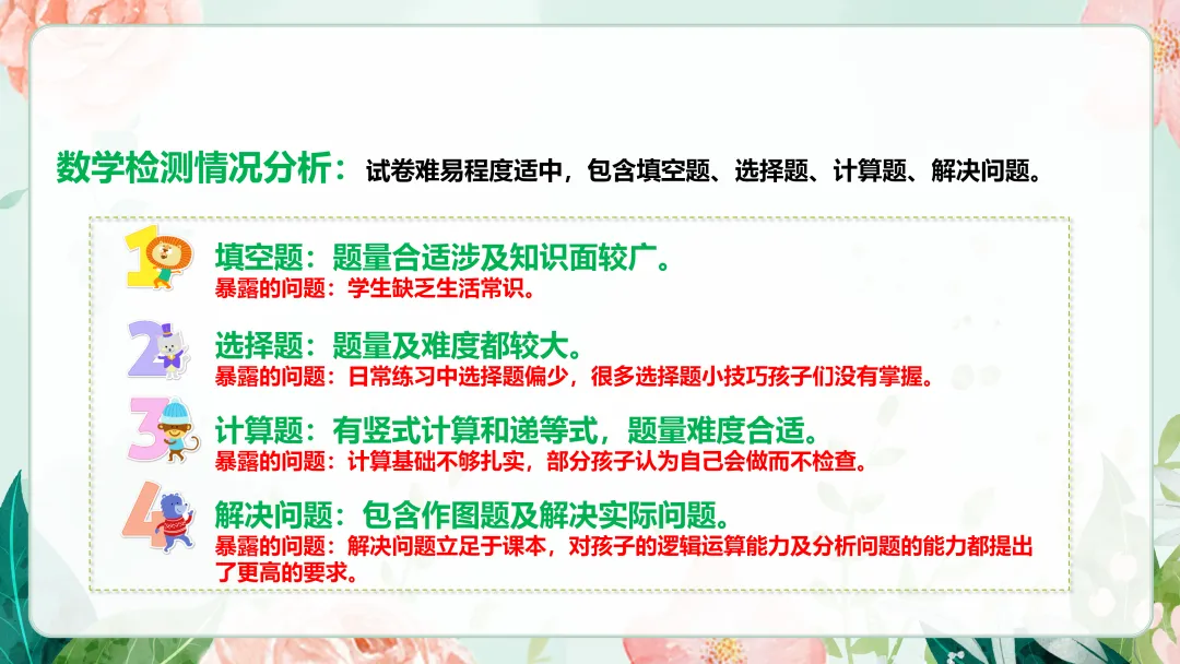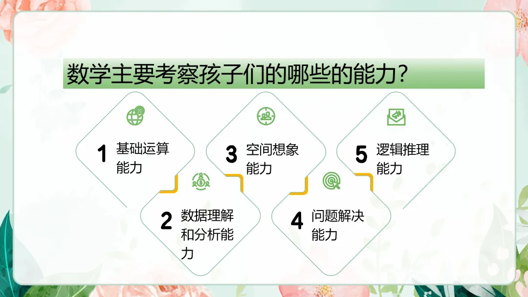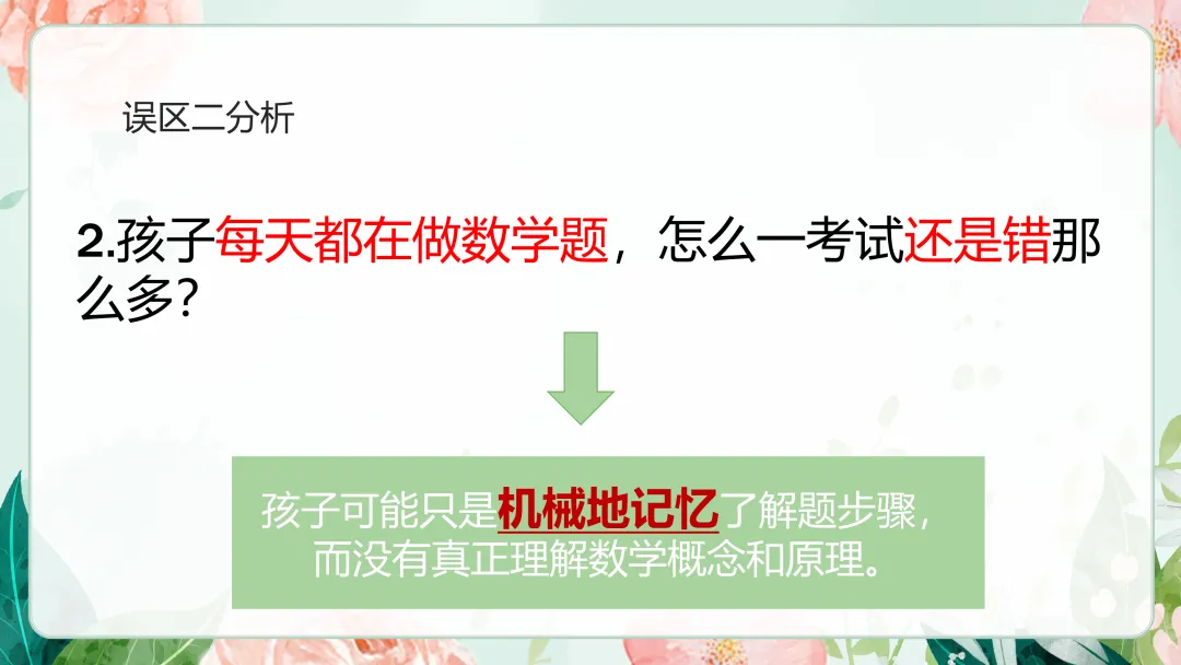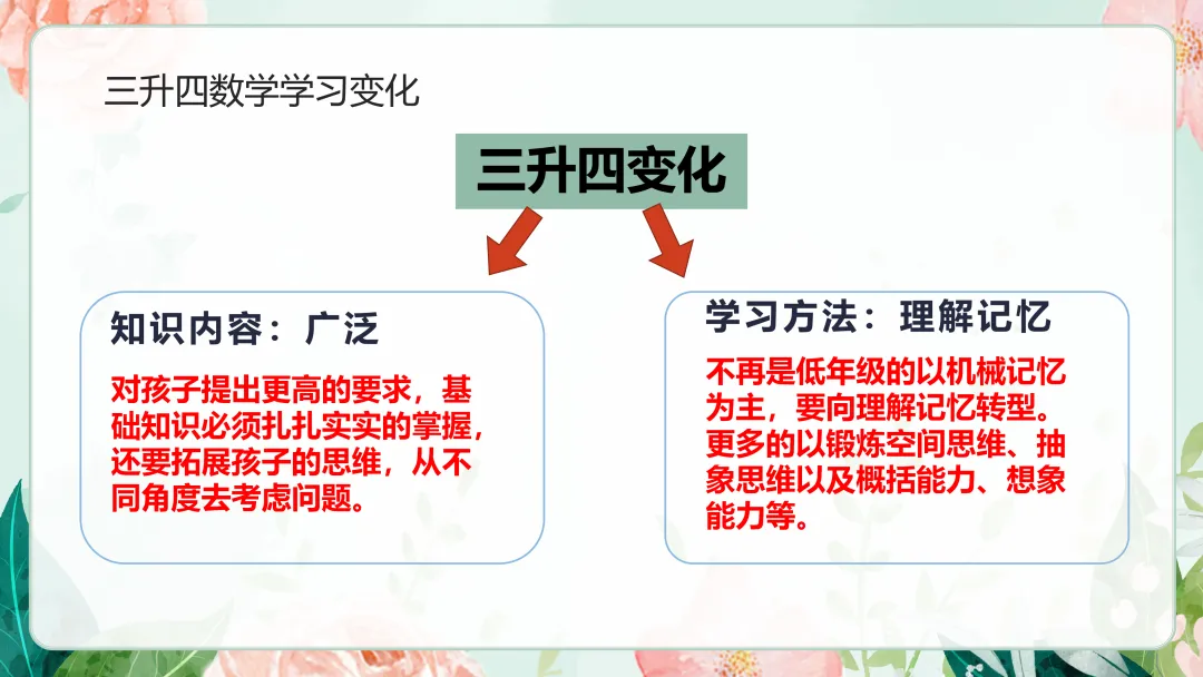不再是低年级的以机械记忆为主,要向理解记忆转型。更多的以锻炼空间思维、抽象思维以及概括能力、想象能力等。