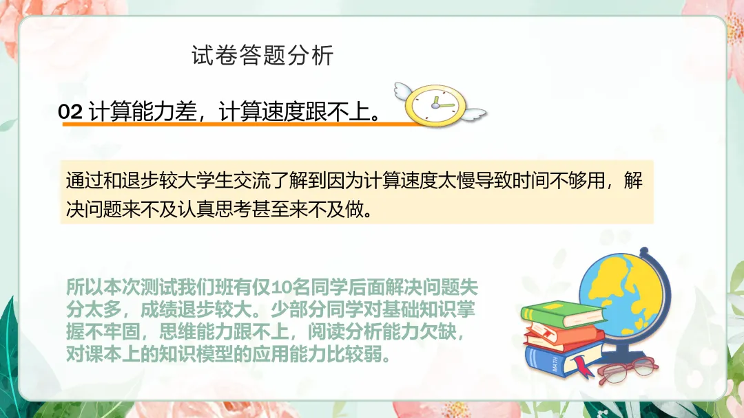 2.从做题规范上看。(书写、草稿本上的计算、应用题答和单位有没有,改错,做题痕迹答:100平方米,答:20个)