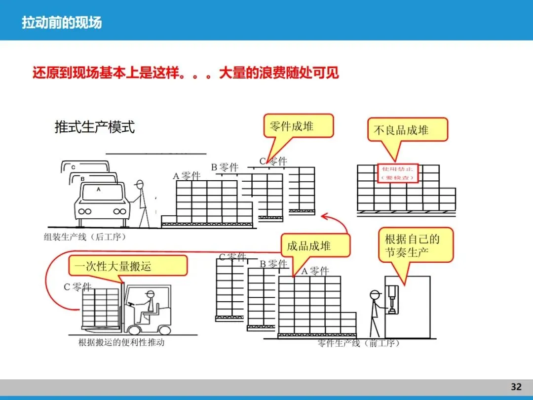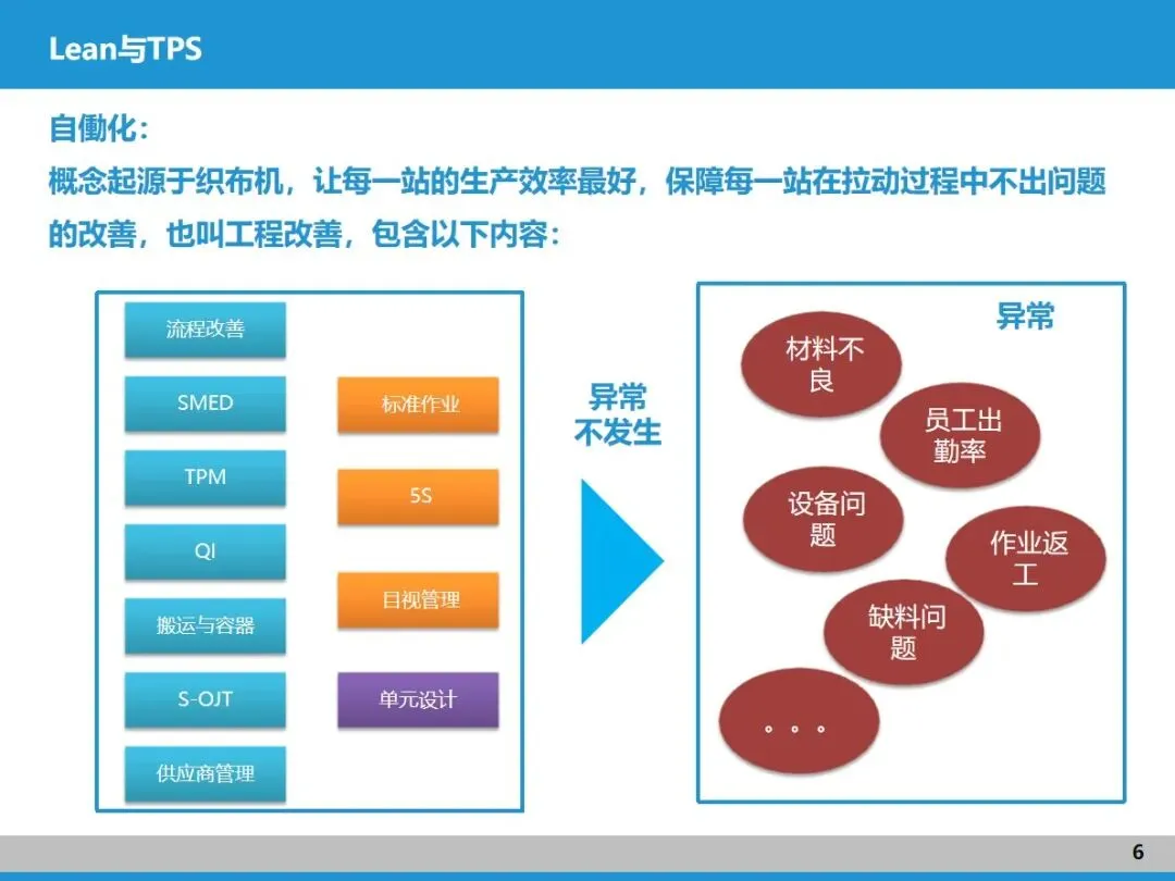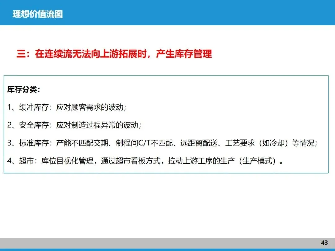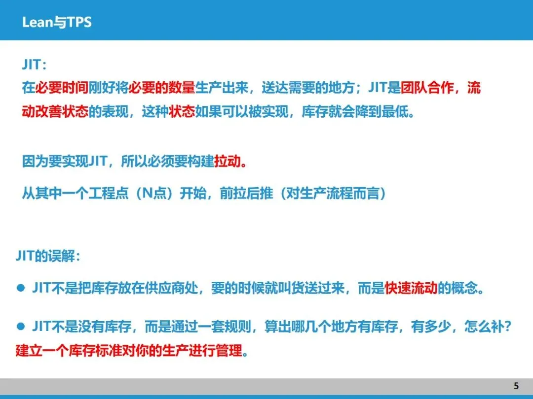 精益生产脱胎于丰田的 TPS 系统,核心是杜绝七大浪费。它的两大支柱 ——JIT 准时化和自働化,正是优化价值流的关键抓手。JIT 强调 “在需要的时候,提供需要的量”,核心是让生产快速流动,不是单纯追求零库存,而是通过规则明确库存位置、数量和补充方式,这就需要靠拉动机制来实现;自働化则源自织布机的灵感,聚焦每道工序的效率提升和异常防控,通过 5S、TPM、快速换模等工具,让每个环节都稳定可靠,为价值流顺畅运行打基础。