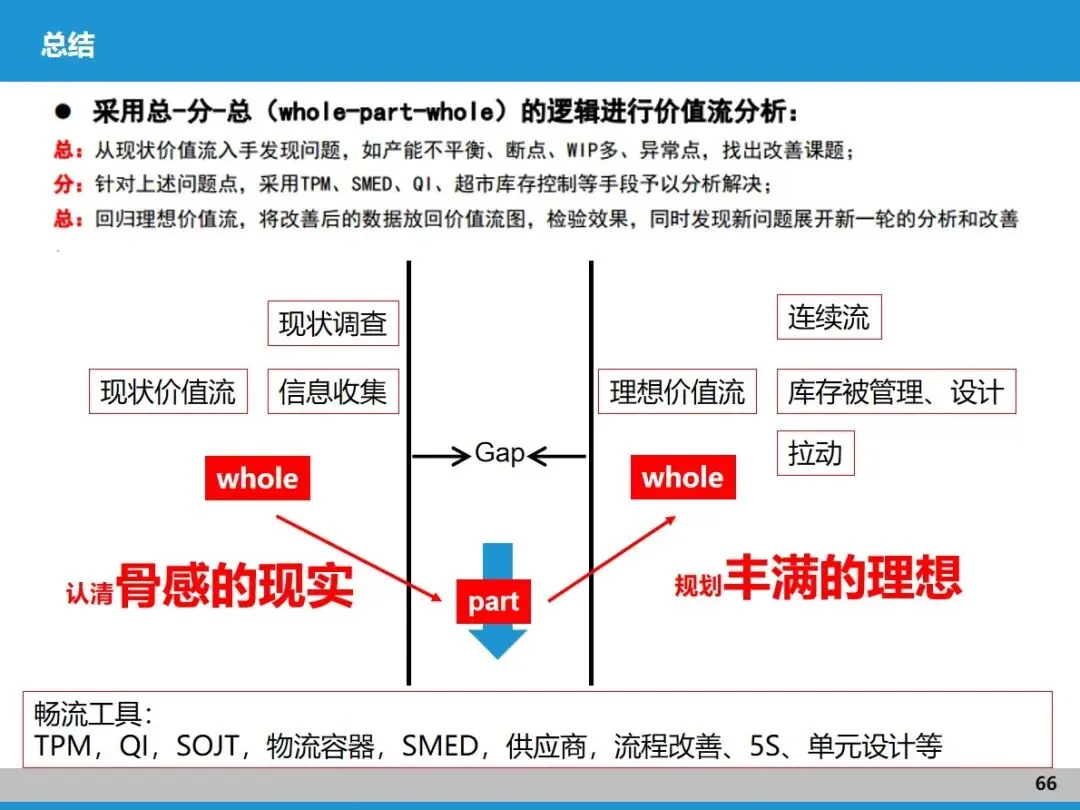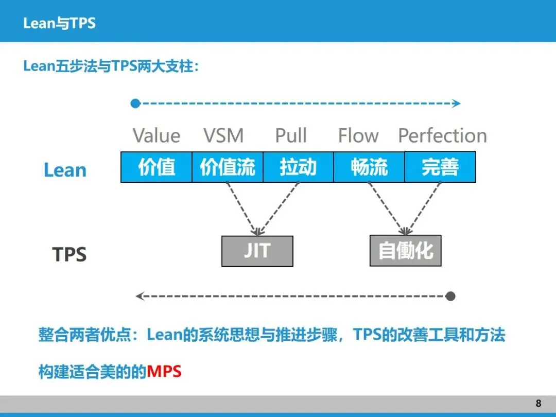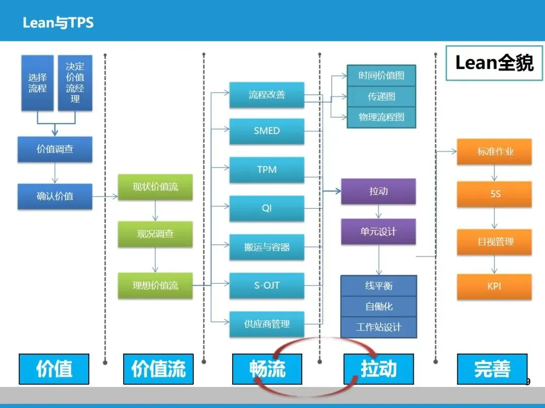 精益五步法(价值、价值流、拉动、畅流、完善)和价值流形成了完整闭环:先通过价值流明确客户真正需求,再用价值流图梳理流程,靠拉动机制优化供需,最终实现价值流连续流动,还能持续迭代改善。美的等企业就是整合了 Lean 的系统思路和 TPS 的实用工具,打造了适配自身的价值流管理体系,最终实现降本、提效、缩短交期的目标。