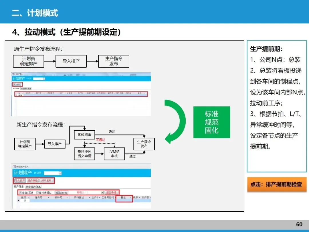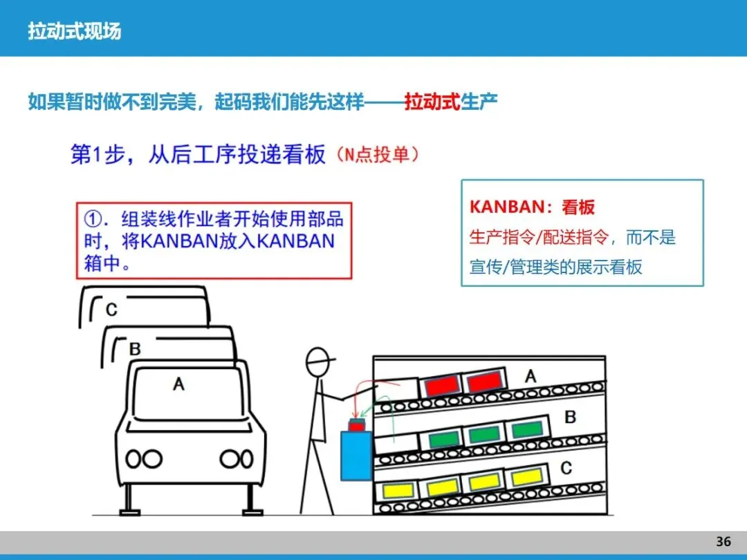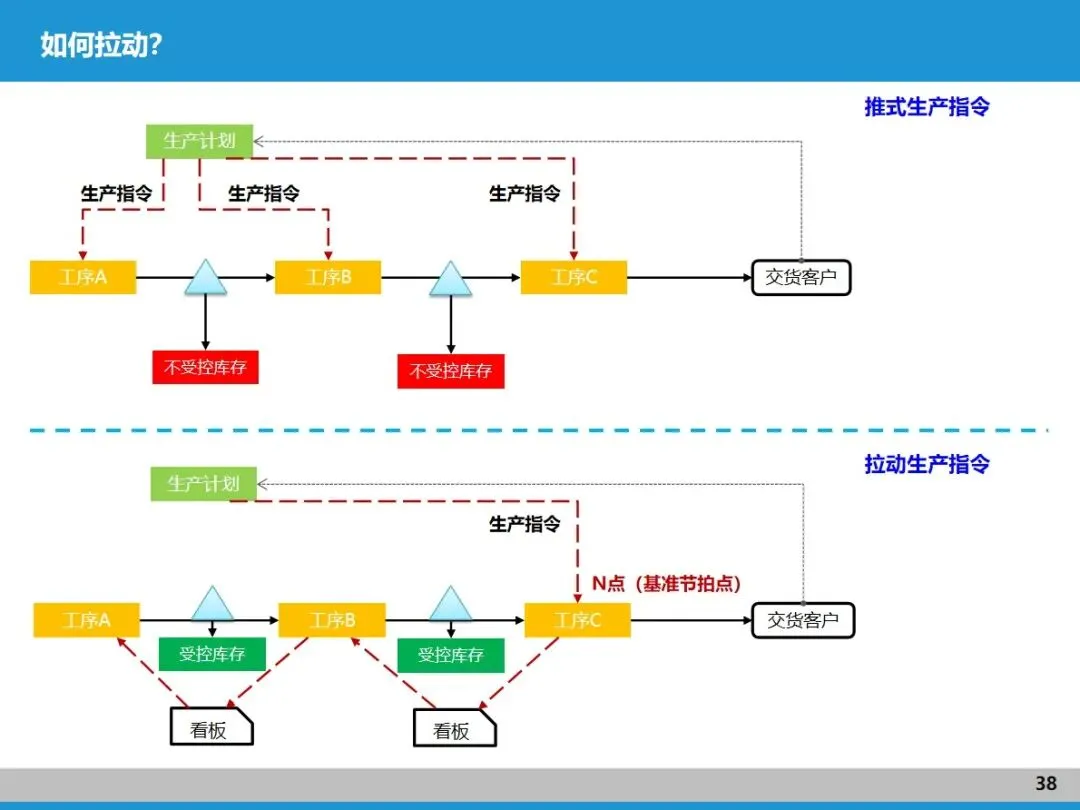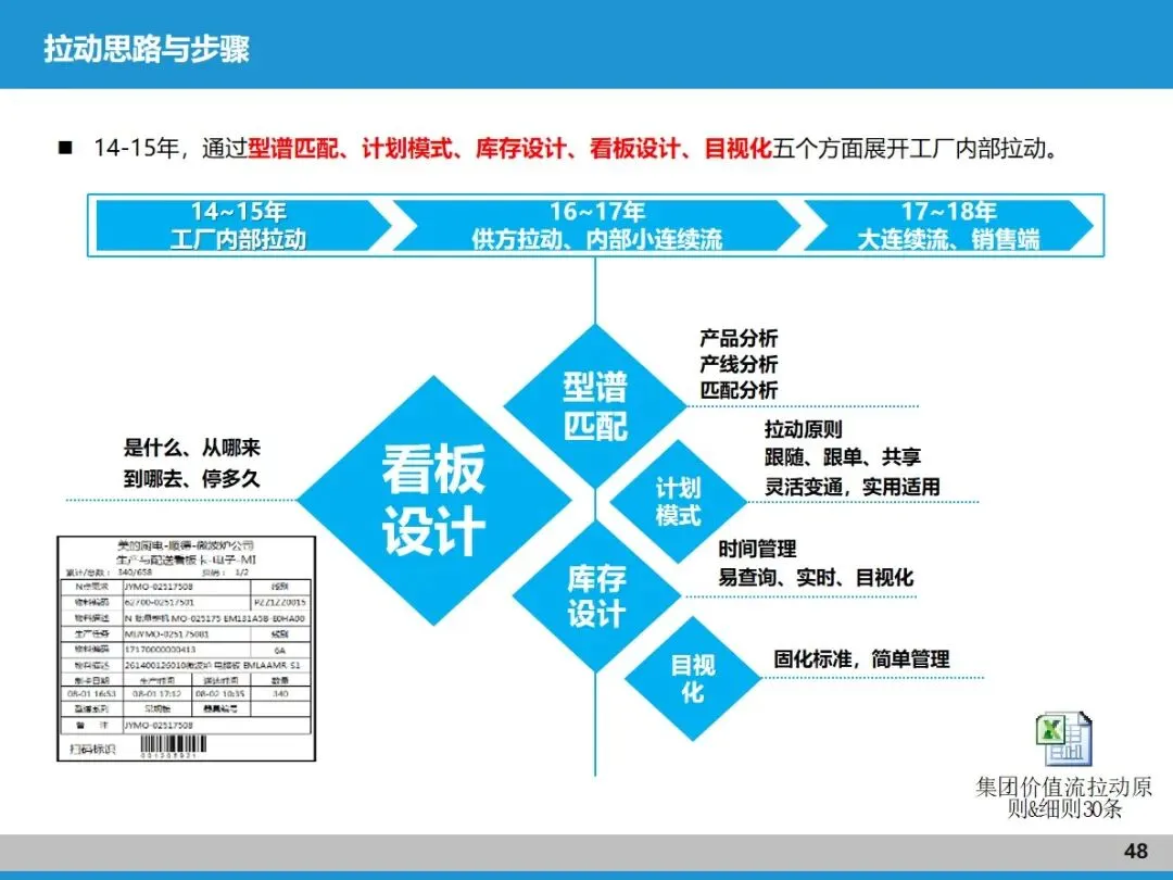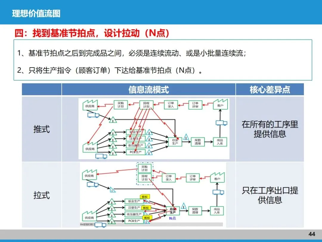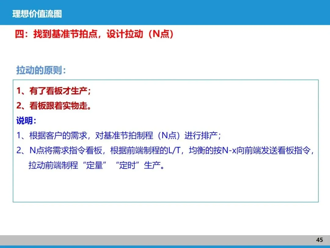 拉动式生产是价值流和精益管理的核心连接点。推式生产容易让各工序 “各自为战”,造成大量库存浪费;而拉动式生产是以客户需求为 “指挥棒”,从 N 点(基准节拍点)出发,用看板传递生产和配送指令,做到 “见单生产、看板随行”。这需要先做好产品型谱匹配,让节拍相近的产品适配对应产线,再通过精准计划排程和标准化库存管理,确保各环节协同响应。